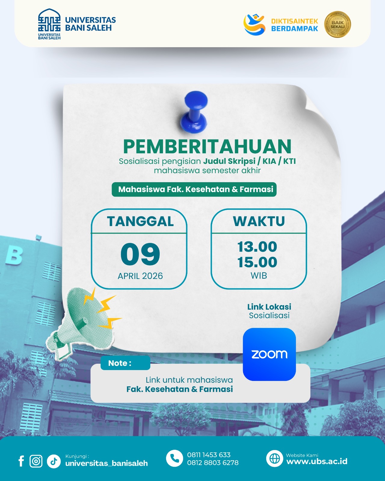 Dalam rangka mendukung kelancaran proses akademik mahasiswa tingkat akhir, Fakultas Kesehatan dan Farmasi Universitas Bani Saleh akan menyelenggarakan kegiatan Sosialisasi Judul Skripsi melalui Sistem Informasi Akademik (SIAKAD).