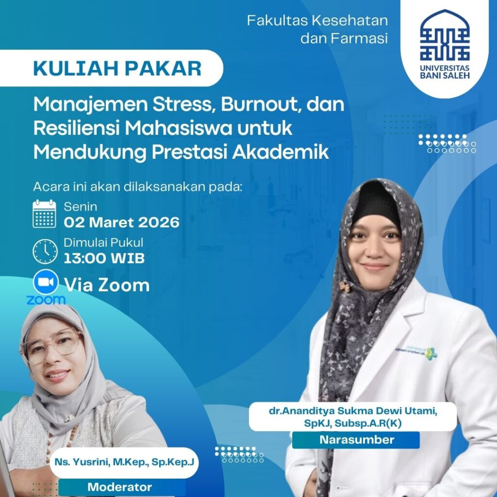 Bekasi, 02 Maret 2026 – Fakultas Kesehatan dan Farmasi (FKF) Universitas Bani Saleh menyelenggarakan kegiatan Kuliah Pakar dengan tema “Manajemen Stres, Burnout dan Resiliensi Mahasiswa untuk Mendukung Prestasi Akademik”. Kegiatan ini menghadirkan narasumber Ananditya Sukma Dewi Utami, Sp.KJ, Subsp. A.R (K) dan dimoderatori oleh Yusrini, M.Kep., Sp.Kep.J.** Acara ini diikuti oleh mahasiswa Program Studi S1 […]