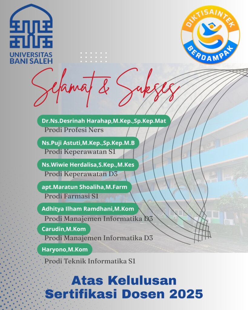 BEKASI — Universitas Bani Saleh (UBS) dengan bangga mengucapkan selamat kepada para dosen yang telah berhasil meraih sertifikasi pendidik (serdos). Capaian ini merupakan bentuk pengakuan atas profesionalisme, dedikasi, dan kompetensi mereka dalam menjalankan tri dharma perguruan tinggi. Para dosen yang berhasil mendapatkan serdos ini adalah:
