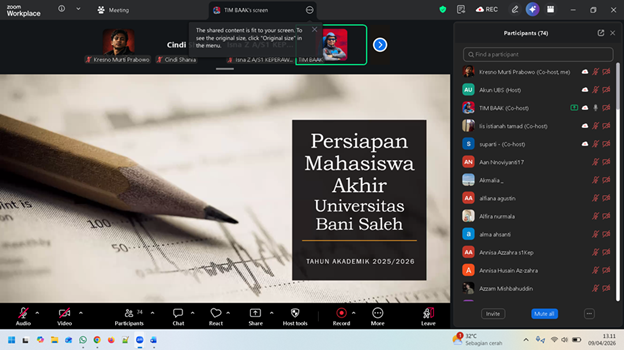 Melalui kegiatan ini, diharapkan mahasiswa dapat lebih memahami prosedur akademik secara menyeluruh serta meminimalisir kesalahan administratif dalam proses penyelesaian studi. Selain itu, kegiatan ini juga menjadi bentuk komitmen Universitas Bani Saleh dalam memberikan layanan akademik yang transparan, terstruktur, dan berbasis digital.